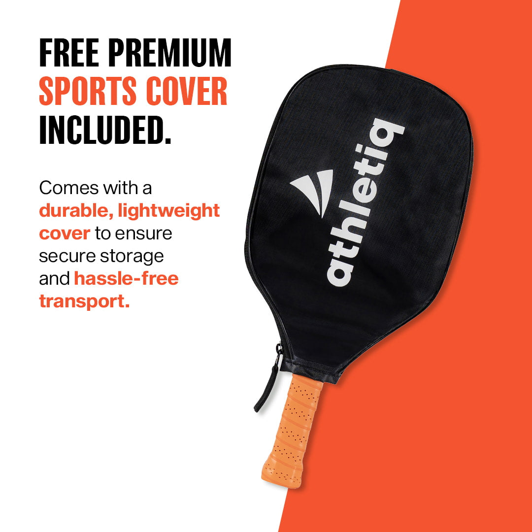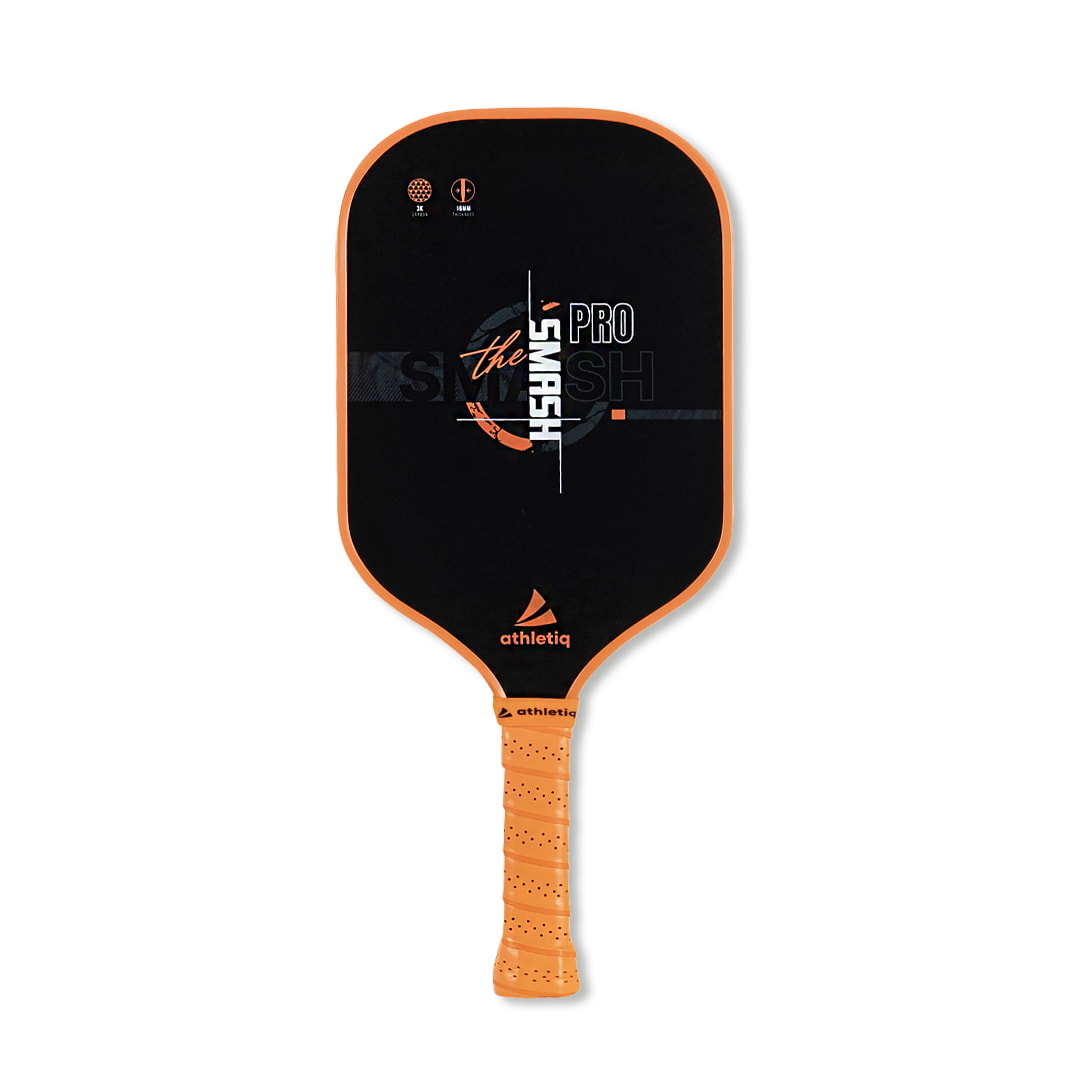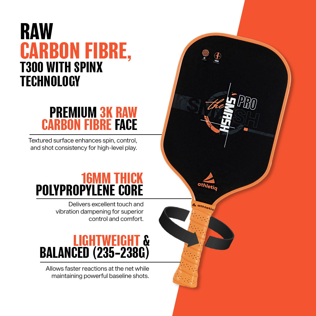 Athletiq SmashPro Paddle is designed with premium raw carbon fibre, T300 with SpinX technology.- Raw Carbon Fibre: Premium 3K fibre, T300 with SpinX technology.